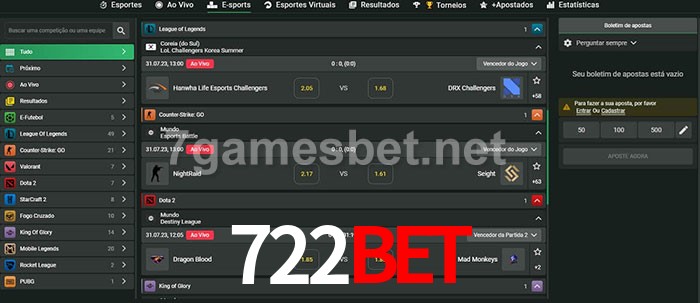 O 722bet oferece uma grande seleção de opções de apostas em e-sports com probabilidades competitivas